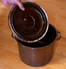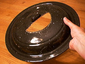 A lid for your "oven" must be fashioned with a hole in it where the hot gases can exit. The idea is to create a draft of hot gases from the bottom of the oven to the top. If you use this kind of pot, it's a good idea to cut the hole with minimal damage to the surrounding porcelain. |