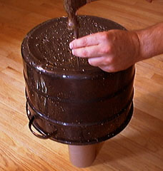 | In my days as an apprentice charcoal maker, I would simply place the retort can over an open fire. I found that it was difficult to achieve a steady, well controlled heat source. I had to constantly add fuel to the fire and check it often. Even with great attention, the heat was not distributed evenly. The result was that there were often cool spots in the retort where the charcoal was brown instead of black, indicating that the wood conversion to charcoal was not complete. Even worse, cooler areas of the retort lid would allow condensation of the reaction gases on the inside of the lid. The accumulation of these tars left a mess that was impossible to remove. All of these problems are eliminated by the new cooker. Now, the retort stays fairly clean, I don't have to constantly tend the fire and the temperature is even and controllable. | |