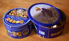 Many simpler alternatives can be considered for the retort container. These Christmas cookie cans work great. Add a couple of screws to hold on the lid, put a hole in the top or bottom and you're all set. (Editorial comment: You know you're a pyro when you buy stuff you don't need just to get the container. I don't care for these cookies, but I will gag them down just to justify buying the can.) My objection with this approach is that this kind of container will only last for about 5 or 6 roastings before the thin metal walls loose their integrity. Then I have to eat more cookies. |