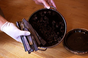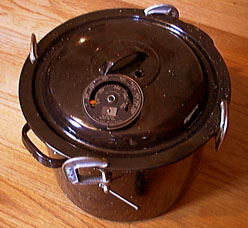 Now we turn our attention to the retort container. This pot is a miniature version of the oven pot. I bought it at a garage sale for $1.00. Wood stove cement and fiberglass gasket material were used to seal the lid which is held in place by 4 mini C-clamps. A single 5/16 inch hole was punched in the lid to vent the smoke from the retort. I like this retort can because it will last for dozens of uses before it will need to be replaced. The handle is handy for lifting it in an out of the oven with a wire hook. |