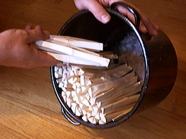 OK, we've finished making our primo charcoal cooker. Let's talk about how to use this hi tech apparatus. Perhaps the most labor intensive part of making charcoal is the preparation of the wood. When using willow, you must remove the bark and split the sticks into smaller sticks no thicker than 1/2 inch. I load the retort as full as possible with the sticks oriented vertically. |