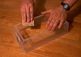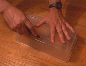 First, get a sharp utility knife and cut out the bottom of the container, leaving about 1/4 to 1/2 inch of a lip around the edges. Usually the container will have a raised ledge molded into the bottom which makes a good guide for cutting. |