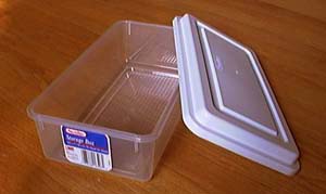 | Conventional wood framed screen boxes are usually about 1 ft. square and 3 or 4 inches deep. I find this much screen area to be more than is necessary. Cleaning them is difficult because of all the corners. Stacking them for multiple grain separations is awkward unless extra rails are added around the tops of the frames. Then you have more corners to clean. All these problems can be solved by using plastic storage containers as frames. |