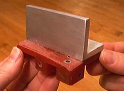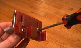 To adjust the jig for the size of steenger you plan to make, you must first loosen the two screws until they allow the guide hole plate to slide relative to the angle piece. Adjust the screws to be slightly snug so that the two jig pieces aren't overly floppy, but will slide with a little effort. |