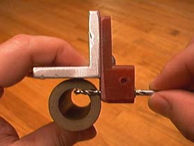 Now the tube is held in the drilling jig, as shown. The guide hole should be located so that the side vent hole will be drilled just above the nozzle. In case you haven't figured it out, you'll probably have to remove the tube from the spindle base to drill the side vent hole. |