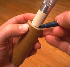Before drilling the side vent hole in the body tube, a mark must be made on the outside of the tube to indicate where the top of the nozzle is located. Start by applying a piece of masking tape to the rammer so a mark can be easily made on it. Then place the rammer in the body tube until it seats against the nozzle. Now make a mark on the masking tape, as shown. Of course, if you were really on the ball, you could do this right after you finished ramming the nozzle clay, in the step above. |