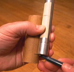 Next, remove the rammer and hold it against the outside of the tube with the mark you just made even with the top of the tube. Make a mark on the body tube at the bottom of the rammer. This mark should now indicate where the top of the nozzle is inside the tube. |