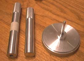 Tooling is usually the first consideration of any new pyro project. Since the tooling for steengers is fairly simple, it doesn't cost much to buy it from professional sources. I purchased a tooling kit for the 3/4 inch steengers from Skylighter for the bargain price of $44.95 US. Shown in this picture, a machined aluminum spindle is mounted in a ramming base and held in place with a bolt through the bottom. The rammers consist of an aluminum rod with a hole in it for pressing the black powder fuel around the spindle and a solid one for pressing the fuel and delay composition above the spindle. |