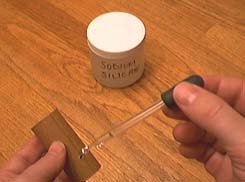 The vent hole can be made to be much more impervious to hot exhaust gasses by treating it with a few drops of sodium silicate solution, as shown in this picture. An eye dropper is used to put the silicate into the hole. A toothpick or small nail is then used to spread it around in the hole and prevent blockage or constriction of the hole. Some of my impatient pyro friends skip this step to avoid waiting the required 20 minutes for the silicate to dry in the vent hole. Their steengers still seem to fly just fine, albeit possibly not quite as high. |