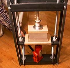 With the tube cut to the desired length, it is placed over the spindle on the spindle base and a carefully measured amount of nozzle clay is poured into the tube. A small funnel of some sort, as shown on the floor in the picture, is very helpful in accomplishing this. Klofkorn's original article advocated the use of 4.3 cc of powdered Hawthorne Bond clay for the rocket nozzle. I use a 60%/40% mix of bentonite and kyanite treated with an additional 5% of toilet seal wax dissolved in Coleman fuel. Instead of using a volume measurement for the nozzle clay, I recommend that you use a weight measurement so that a consistent nozzle length is achieved. The importance of doing this will become evident shortly. Stay tuned. If you are not using a hydraulic press, the nozzle clay is compacted by administering about a dozen firm blows with a mallet of some sort, as shown in this picture. |