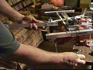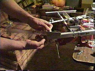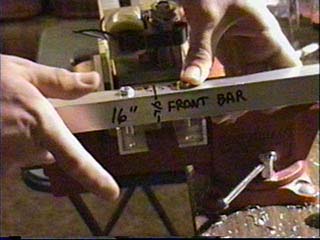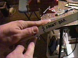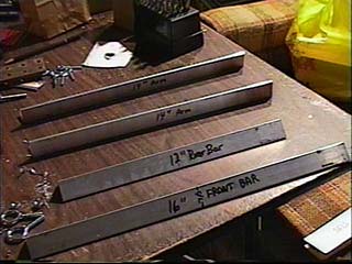 The Frame: The structure of the motor platform is constructed from the 1-inch angled aluminum stock mentioned previously. The finished platform is quite rigid, and can handle a substantial amount of weight. The two 4-foot sections of this stock should be cut up as follows: Cut one 20-inch section from each bar. Cut 2 14-inch lengths from the remains of the first bar, and a 16-inch and 12-inch section from the remains of the second. The 'leftover segments' are shown at left, minus the two 20-inch sections that will form the motor mount. |