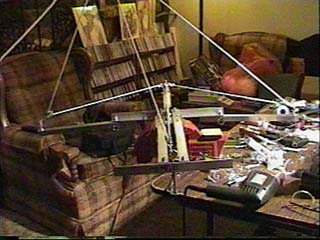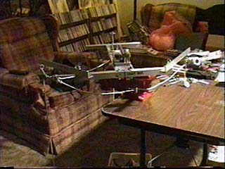 The image at right shows the motor platform with the control lines installed. The thick lines should be blackened with a permanent felt tip marker to keep them 'invisible.' If you want to keep the lines to your marionette thin, cut the lines such that they hang just below the pulley when the crank pivot is farthest the pulley for each line. Attach lengths of nylon monofiliment (thin fishing line, or whatever you wish) to the control lines at this point and run them to the marionette's attachment points. Hang the motor platform and test your arrangement with the motor running. The motor's electrical lines are nonpolar, and can be atached to lamp cord, although we recommend a grounded (three-prong) cord set. The ground lead (usually green) of the cord set should be securely attached to the motor platform. | ![]() |