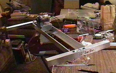 The movement of the marionette, when suspended from this slow-moving apparatus, is amazingly natural-looking. The body of the ghost slowly rises and falls, and the arms gesture independently of that movement. You really have to see the effect to believe that it can be achieved with such a simple rig. Experiment by moving the pivoting arms to different positions. What this does it to change the phase relationships (relative timing) of the moving parts. You will notice that the marionette tends to turn slightly to left and right as she flies. This adds to the drama, as if she were addressing a group of guests. If you find that the movment of the ghost's arms is shaky, add some weight beneath the hands (such as a fishing sinker.)