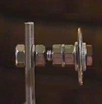 The attachment of the front and rear bars is accomplished as shown, with 1/4 inch bolts. Note that there are a pair of 'limit nuts' positioned as shown in the photo to keep the stock from bending when the attachment nuts are tightened. Position these just at the lower edge of the crossmembers, both front and back. Use lock washers to fasten the crossmembers securely. When both crossmembers are attached, the frame becomes quite rigid. (The video describes in detail where the holes shouls be drilled in the motor mount members, but it should not hard for the mechanically savvy builder to deduce this from the pictures at left and below.) |