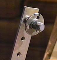 The pivot at the outer end of the crank, to which the control lines attach, consists of nothing more than a bolt attached to the bar through a hole, with a wide fender washer that is set so as to spin freely, using the bolt as an axel. The fender washer has three holes drilled with equal spacing around its perimeter, forming the attachment points for the lines leading to the marionette's head and arms. The part sequence is illustrated in the photo at left; left to right: Nut...crank...lock washer...nut...lock wahser...nut...flat washer...drilled fender washer...flat washer...head of bolt. This assembly can easily be moved to the various holes you may have drilled into the crank arm to adjust the extremities of the marionette's movement. |