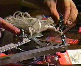 The arm pulleys attach to eyebolts mounted at the ends of the arms as shown, using nylon twine. This allows the pulleys to twist as the crank changes position. The control lines for the marionette's arms lead through the pulleys to the crank pivot. The pulley wheels should be reasnoably close to the plane of the pivot when the lines are under tension. This is somewhat automatic, because the pulley will swing toward the pivot when under load. You must make sure that the lines and pulleys do not snag on the crank when it is in operation. Adjust the horizontal angle of the crank on the motor shaft to assure this. In other words, don't let the crank's pivot end hang down too far towards the floor. | ![]() |