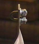 The clamp attaches as shown at right. Note that the aluminum stock is twisted 90 degrees so that the wide dimension of the end holding the pivot assembly is parallel to the ground. Use a vise and Vise Grip pliers to do this. You will find that the bar bends relatively easily. A picture of the completed crank is shown on the first page of these instructions. |