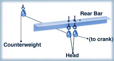 The mounting eye for the pulley supporting the marionette's head attaches to the center of the rear crossmember. We use an eyebolt with a 4-inch long shaft, and locate the eye below the frame, where the head pulley can be attached. The top of this long bolt - extending above the frame - is fitted with a fender washer (like the one used for the crank pivot) drilled with a single hole. This is used for hanging the back of the frame. The diagram shows how to add the additional hardware for a counterweight, should you decide to fly a heavy marionette. The counterweight should be a bit lighter than your weighty ghost. (The marionette described in these instrctions should not require a counterweight.) |