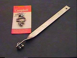 * Two 4-foot lengths of aluminum L-stock, with 1-inch sides. You will need 1/4 inch, 1 1/2 inch long diameter bolts and eyebolts to assemble the motor platform. You will also need some flat aluminum stock, 1/8 inch thick by 1 inch wide by at least 2 feet long. You will also need a small U- bolt, available as a component of a wire clamp kit (such as Campbell part 767-5117 - a kit intended for 3/16" size wire, shown at right) small enough to encircle the motor's output shaft. It will be used to mount the aluminum stock to the shaft and form a crank, as shown. Hardware stores like Home Depot commonly carry these items. These materials will be used to build the motor and animation assembly, which will be described and shown in pictures below. | ![]() |