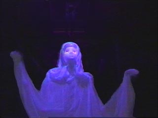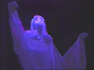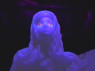 She floats in mid-air, wrapped in an ethereal glow, her eyes blazing red and piercing the souls of all who see her. Her arms move smoothly, each in its own natural way, while she slowly hovers, rising and falling as she gestures (the animated image above speaks for itself). Depending on the whim of her builder, she even may speak, her eyes flashing with the words. Would you like to invite to her to inhabit the confines of your beloved haunt? If so, ready your lab and prepare to conjure her forth, for Victoria's mechanism is simplicity itself and the plans for her construction lie below. Don't blame us if she haunts your house indefinitely! As mentioned in our article, Halloween - Just Imagine, we suggest creating a background for haunts and their inhabitants. This involves a synopsis that imagineers refer to as a back story. The figure is actually an articulated marionette, which hangs from a motor platform that attaches to your attraction's ceiling. She will require some time to construct - 2 or 3 days - but the rewards you reap will more than repay your efforts. You will get complements if you exhibit this stately ghost in your haunt. |