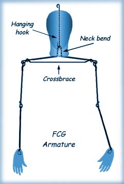 from it will form the figure's shoulders. Make a long hook out of a piece of wire about two feet long. The hook section should be a couple of inches deep. Make a socket in the bottom of the wig form about 4 inches deep, then capture the U-section of the shoulder wire into your hook. Insert the straight segment of the hook member into the hole in the bottom of the wig form and carefully press it through until it emerges from the top of the head. Next, slowly pull the U-section of the hanger piece into the hole until the shoulders are in place below the neck. The part of the hook member coming out of the top of the head may now be formed into a hanging hook. Cut of the excess wire you don't need before forming this second hook. |