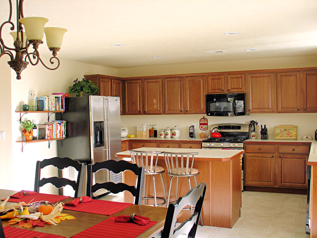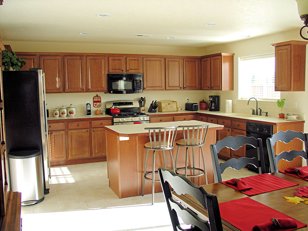 View of the kitchen with the new cabinet pulls.
